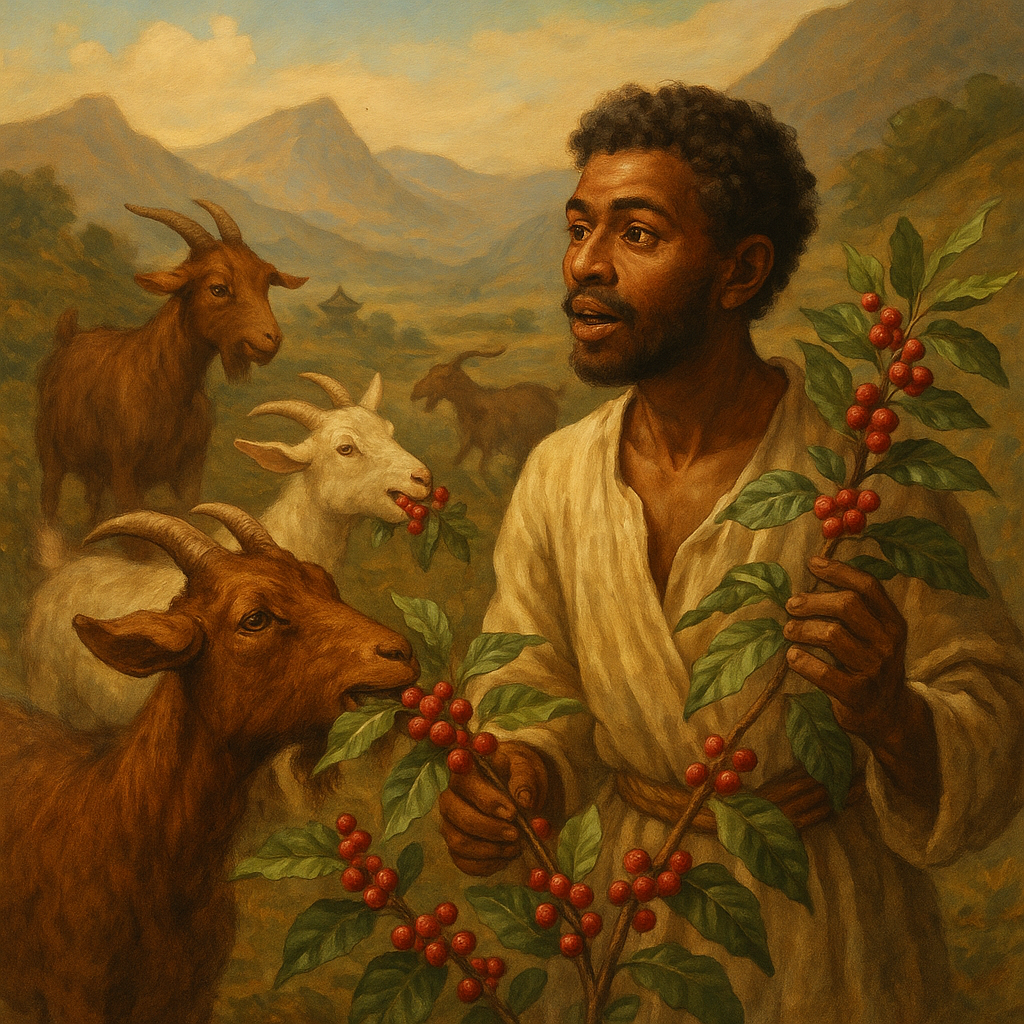 A história mais contada sobre a origem do café remonta ao século IX, nas terras altas da Etiópia. Segundo a lenda, um jovem pastor chamado Kaldi percebeu que suas cabras ficavam mais agitadas e “dançavam” após comerem os frutos vermelhos de um arbusto desconhecido. Curioso, Kaldi experimentou os frutos e também sentiu-se mais desperto.
